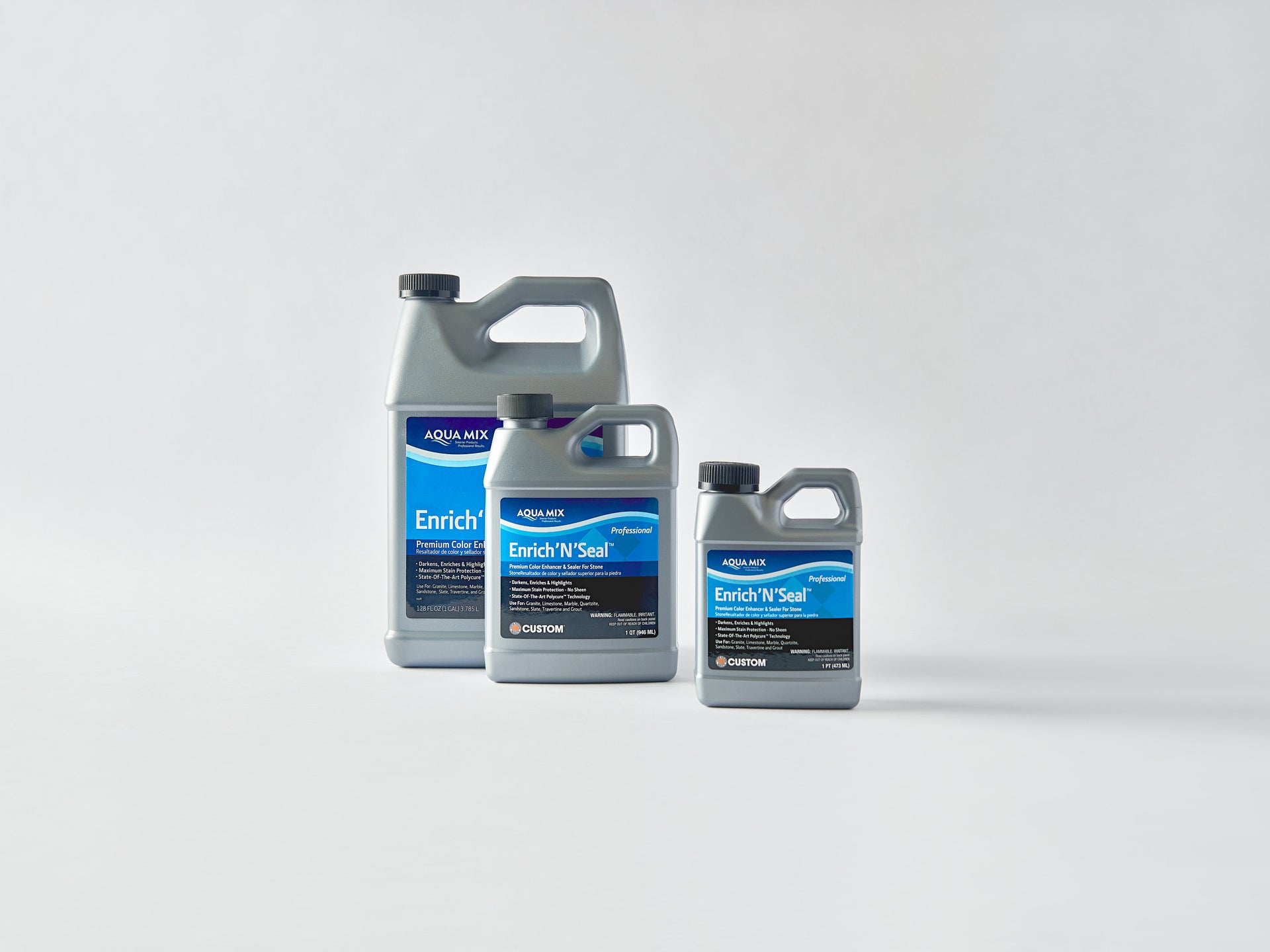 Aquamix Enrich’N’Seal™ is a premium, no-sheen, enhancing sealer for stone, 100% polymer-solid with State-Of-The-Art Polycure™ Technology. It is a penetrating sealer formulated to darken, enrich, and highlight the character and beauty of unsealed natural stone.