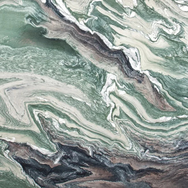 Cipollino Verde is also the name of a type of natural stone that is quarried in Italy. This stone is a type of marble with distinct green, yellow and brown veining that resembles the layers of an onion. The name "Cipollino" actually means "little onion" in Italian. Cipollino Verde is commonly used as a decorative stone in interior and exterior design applications, such as flooring, wall cladding, countertops, and decorative objects.